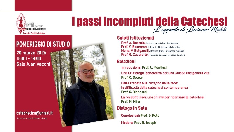Venerdì 20 marzo 2026, alle ore 15.00, presso la Sala Juan Vecchi dell'Università Pontificia Salesiana, si terrà un pomeriggio di studio organizzato dall’Istituto di Catechetica nel ricordo del prof. Luciano Meddi (1958-2025), recentemente scomparso. Il catecheta romano, Ordinario di catechetica presso la Facoltà di Missiologia della Pontificia Università Urbaniana di Roma, insegnava da numerosi anni anche presso la nostra Facoltà di Scienze dell’Educazione, di cui era ex allievo.
