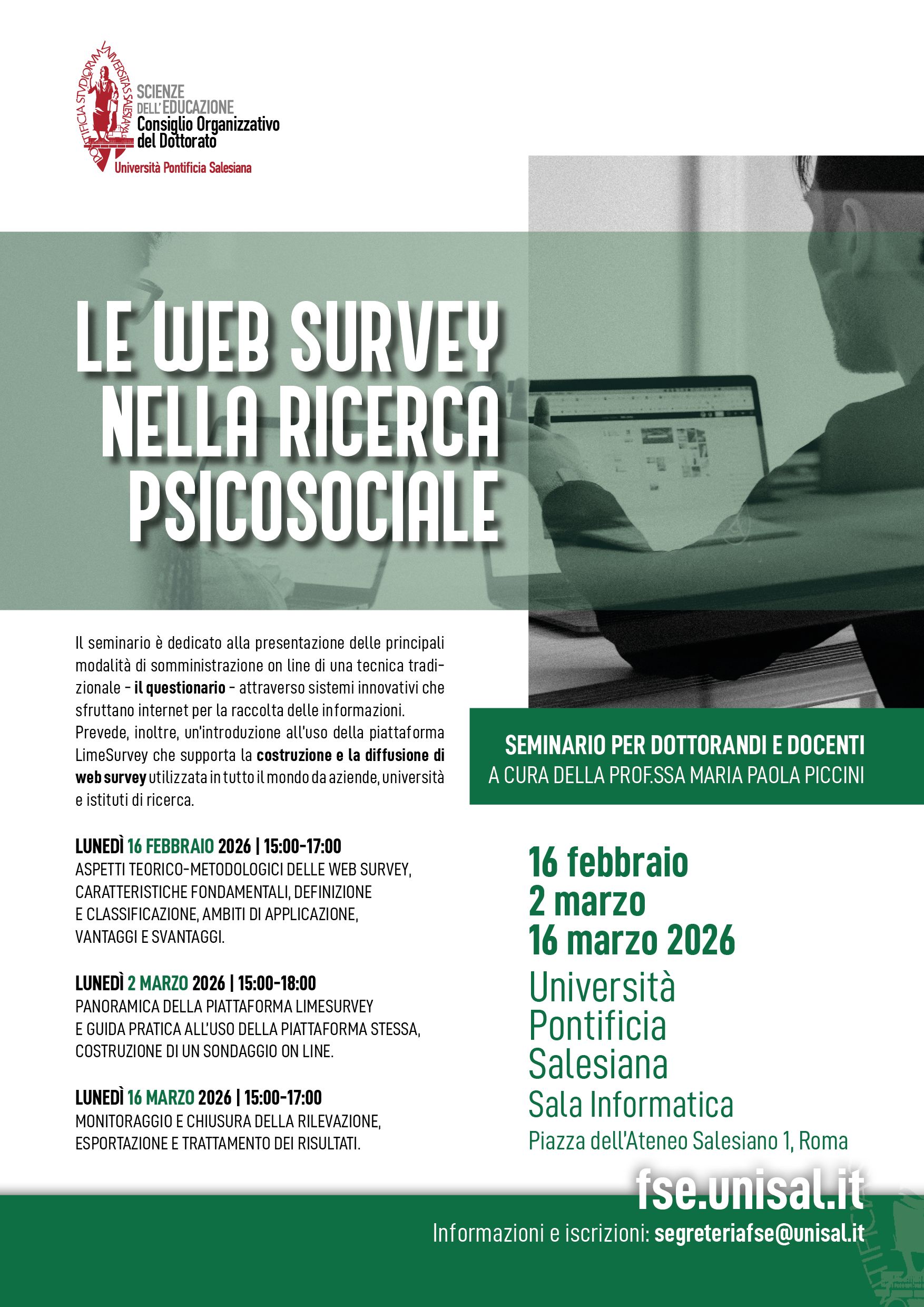 Le web survey nella Ricerca Psicosociale - Seconda giornataSeminario per docenti e dottorandi, promosso dalla Facoltà di Scienze dell'Educazione, che analizza la trasformazione della ricerca psicosociale nella web society, presentando vantaggi e limiti della somministrazione online dei questionari e introducendo l’uso della piattaforma LimeSurvey per la realizzazione di web survey. Sala informatica 15:00 - 18:00 |
