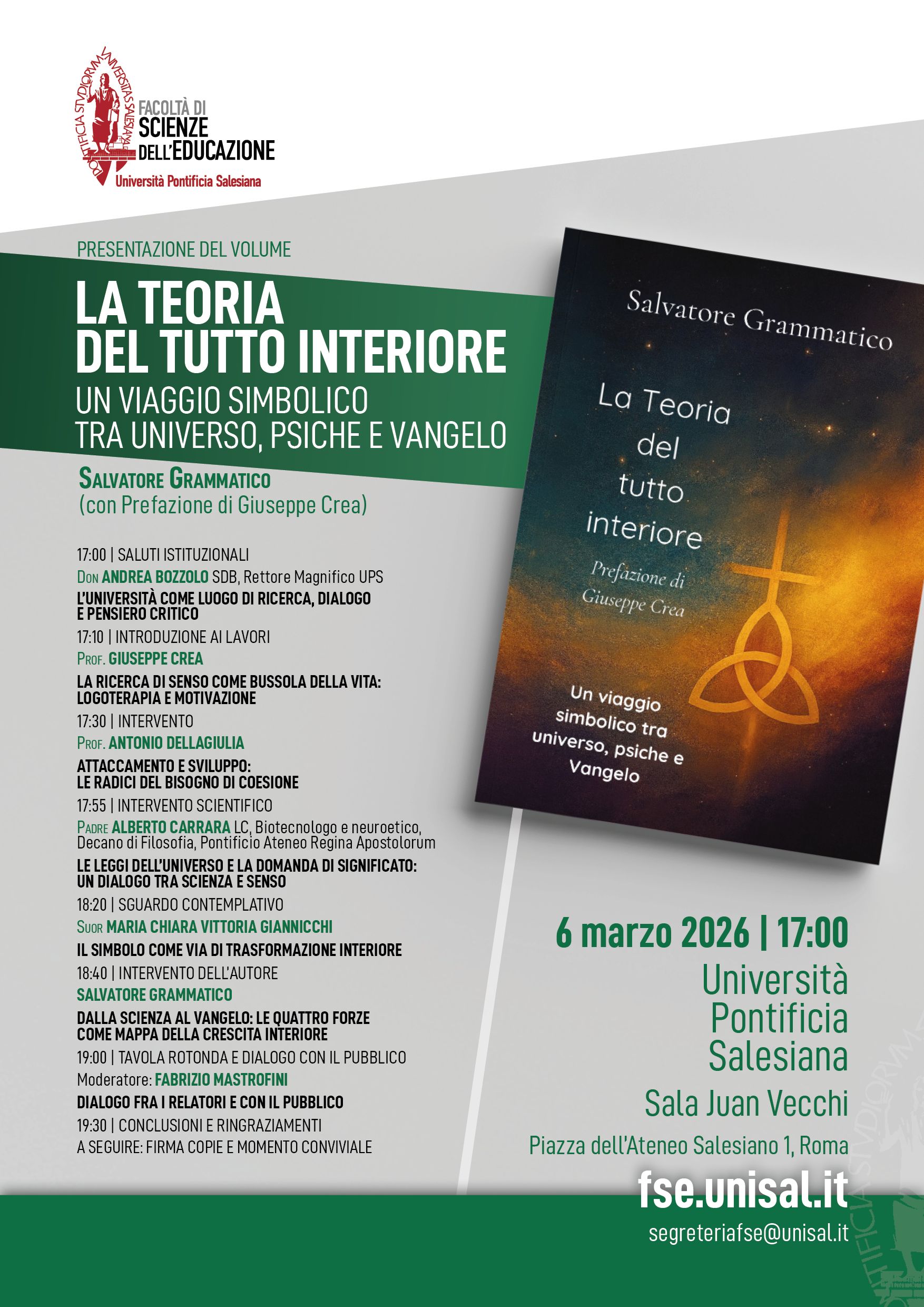 La teoria del tutto interiore. Un viaggio simbolico tra universo, psiche e VangeloPresentazione del volume La teoria del tutto interiore. Un viaggio simbolico tra universo, psiche e Vangelo, che mette in dialogo scienza, psicologia e spiritualità, proponendo una lettura simbolica delle quattro forze fondamentali dell’universo in relazione alle dimensioni dell’esperienza umana. L’evento sarà un momento di confronto interdisciplinare sulle grandi domande di senso e sul loro significato per il presente. Sala Juan Vecchi 17:00 |