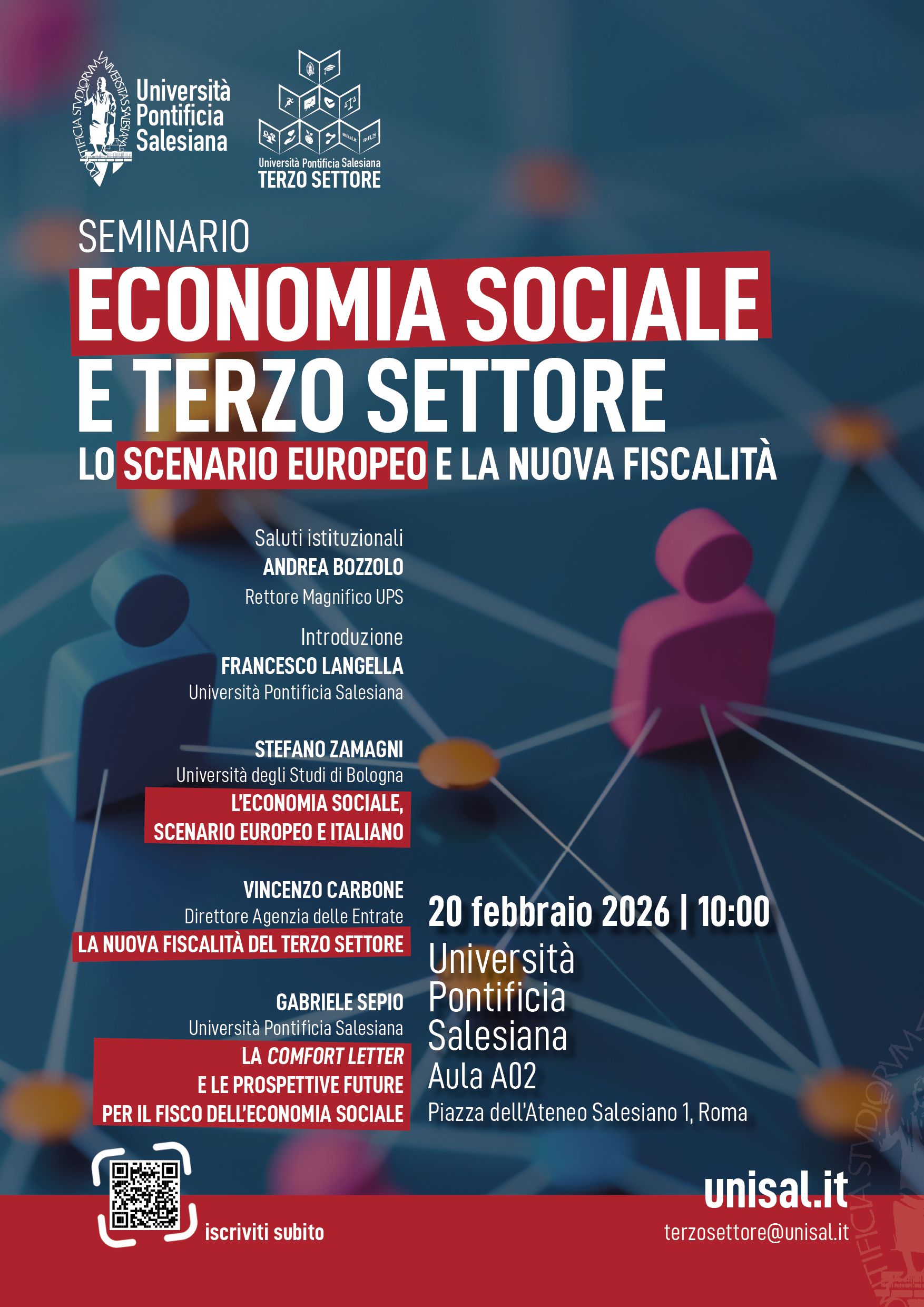 Economia sociale e Terzo settore: lo scenario europeo e la nuova fiscalitàIl Seminario avvierà le lezioni del secondo semestre del Curricolo dedicato al Terzo settore e all'economia sociale. Interverranno il Prof. Stefano Zamagni, il Dott. Vincenzo Carbone e il Prof. Gabriele Sepio. Aula A02 10:00 |