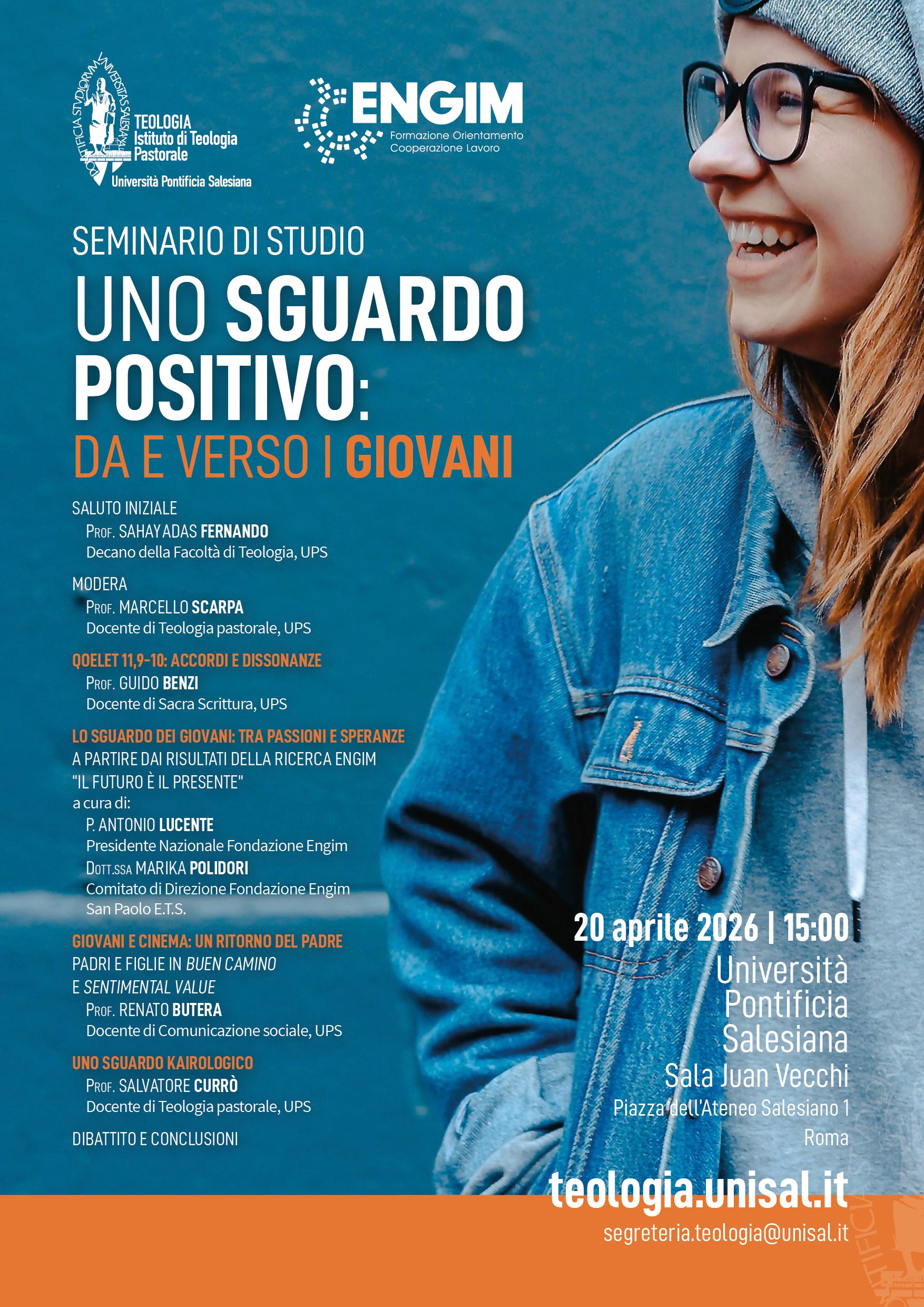 Uno sguardo positivo: da e verso i giovaniSeminario di studio organizzato dall’Istituto di Teologia Pastorale in collaborazione con la Fondazione ENGIM (Ente Nazionale Giuseppini del Murialdo). L'incontro prenderà avvio dal Secondo Rapporto dell’Osservatorio Giovani e Futuro di ENGIM, presentando i risultati di una ricerca che offre prospettive nuove e in parte controintuitive sulle trasformazioni in atto tra gli adolescenti italiani, sulle loro aspettative, sui sogni e sugli orientamenti rispetto al rapporto con gli adulti, alla religiosità, agli strumenti digitali, al lavoro e al futuro. Sala Juan Vecchi 15:00 |