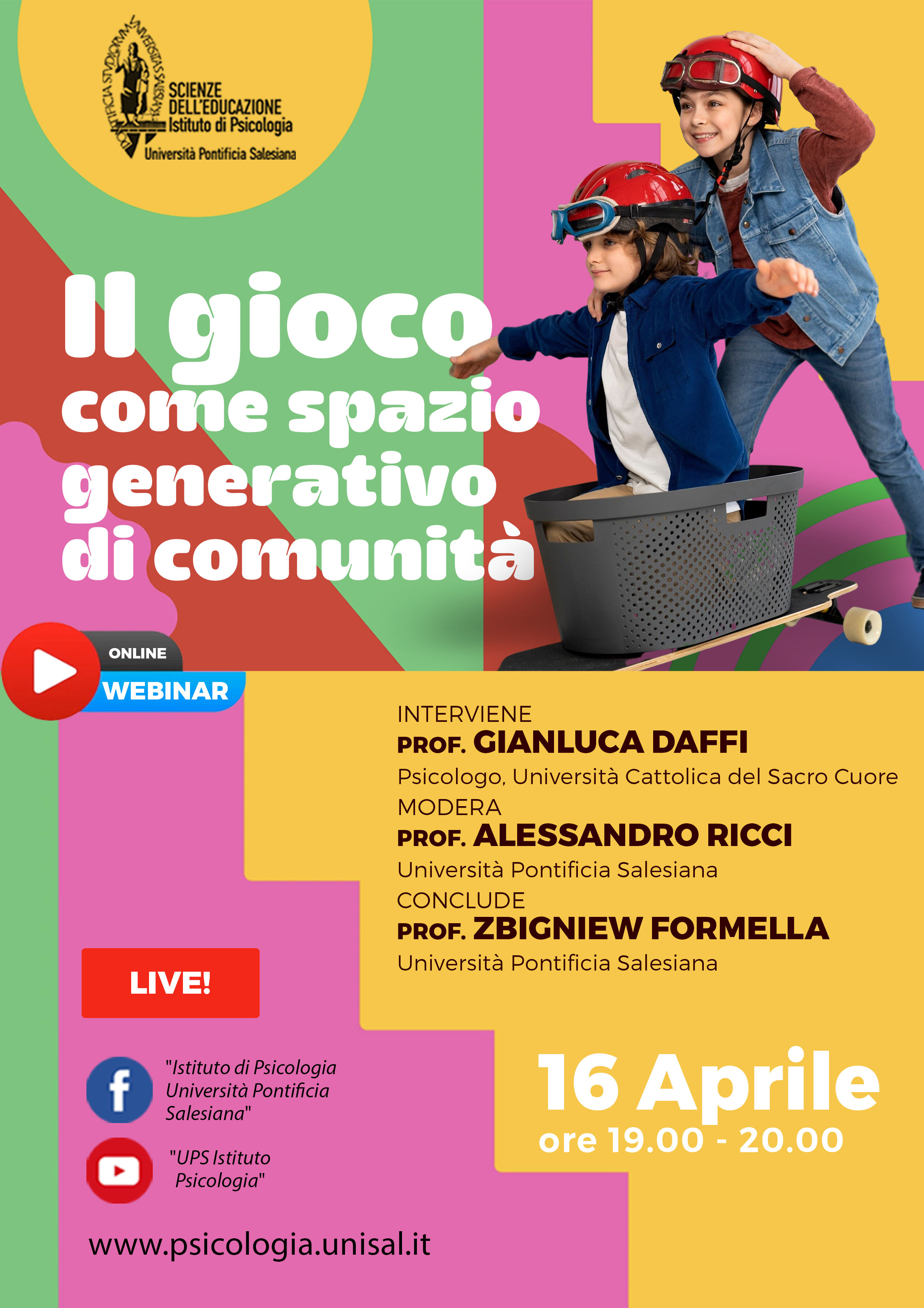 Webinar: Il gioco come spazio generativo di comunitàL'Istituto di Psicologia promuove un webinar gratuito dedicato al tema del gioco come risorsa fondamentale per la costruzione di legami e comunità. L’incontro si propone di approfondire il valore del gioco come spazio generativo, capace di favorire relazioni significative, inclusione e partecipazione attiva nei diversi contesti educativi e sociali. Online 19:00 - 20:00 |