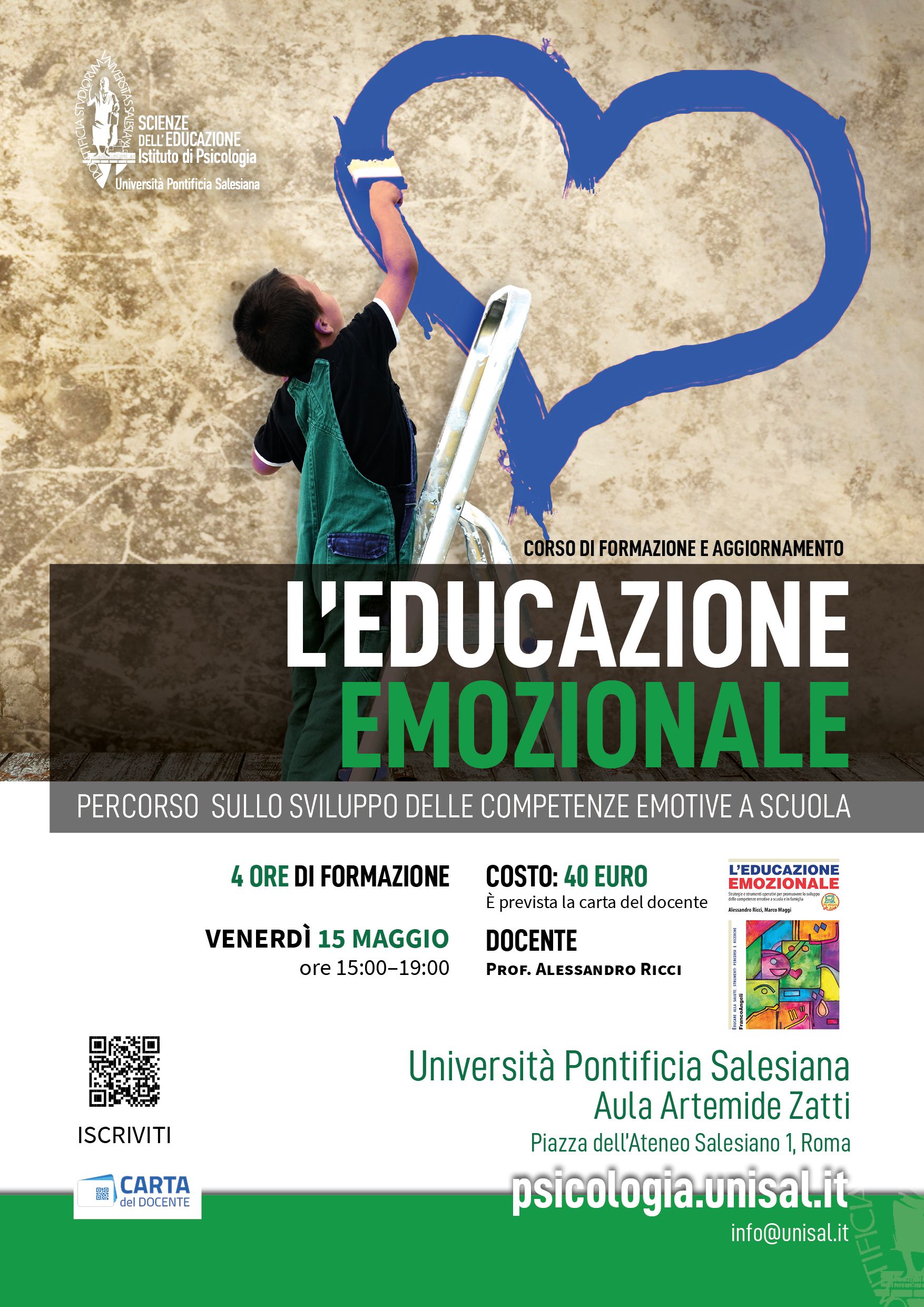 L'Educazione emozionale: Percorso sullo sviluppo delle competenze emotive a scuolaCorso di formazione e aggiornamento, promosso dall’Istituto di Psicologia, pensato per offrire a docenti, educatori e professionisti strumenti teorici e pratici utili a comprendere e gestire le dinamiche emotive nel contesto scolastico, riconoscendone il ruolo centrale nei processi di apprendimento e relazione. Attraverso un percorso mirato e operativo, i partecipanti avranno l’opportunità di acquisire strategie efficaci per promuovere lo sviluppo delle competenze emotive negli studenti e per intervenire in modo consapevole nel dialogo tra scuola e famiglia, contribuendo a costruire ambienti educativi più inclusivi, equilibrati e attenti al benessere di ognuno. Aula Artemide Zatti 15:00 - 19:00 |