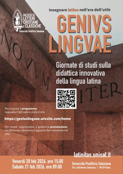 GENIUS LINGUAE: insegnare latino nell’era dell’utileLa Facoltà di Lettere Cristiane e Classiche promuove il Convegno internazionale Genius Linguae, due giornate di studio dedicate alla didattica innovativa delle lingue classiche. L’incontro riunirà diversi studiosi per discutere il futuro dell’insegnamento del latino, confrontare approcci metodologici tradizionali e contemporanei e offrire un’occasione di aggiornamento pedagogico per docenti e ricercatori. Sala Juan Vecchi 15:00 |