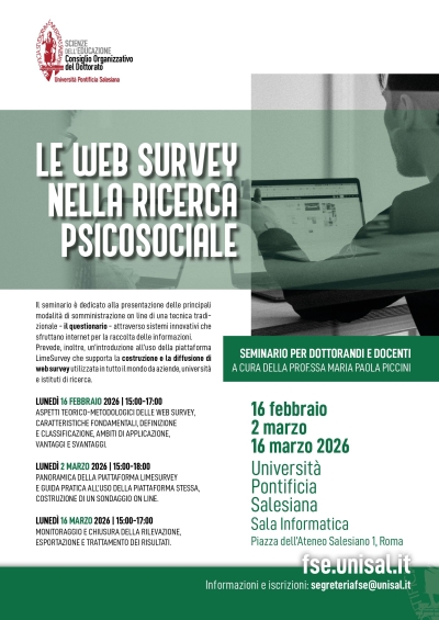 Le web survey nella Ricerca Psicosociale - Prima giornataSeminario per docenti e dottorandi, promosso dalla Facoltà di Scienze dell'Educazione, che analizza la trasformazione della ricerca psicosociale nella web society, presentando vantaggi e limiti della somministrazione online dei questionari e introducendo l’uso della piattaforma LimeSurvey per la realizzazione di web survey. Sala informatica 15:00 - 17:00 |