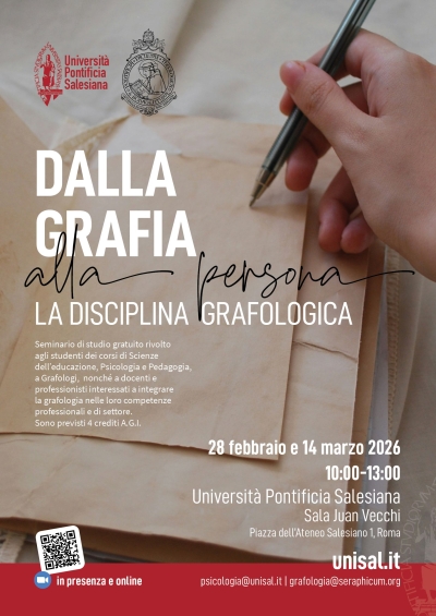 Dalla grafia alla persona: la disciplina grafologicaPrimo appuntamento del seminario di studio realizzato in collaborazione con la Scuola di Grafologia "Seraphicum", dedicato all’approfondimento della grafologia come strumento di conoscenza della persona. L’incontro è rivolto agli studenti dei corsi di Scienze dell’Educazione, Psicologia e Pedagogia, nonché a docenti e professionisti interessati a integrare la grafologia nelle proprie competenze educative, psicologiche e formative. Sala Juan Vecchi 15:00 - 18:00 |