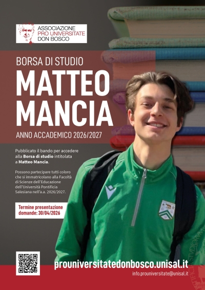APUDBO - Borsa di studio intitolata a Matteo ManciaTermine per la presentazione delle domande relative al Bando per la Borsa di studio "Matteo Mancia", riservata a coloro che si immatricoleranno per la prima volta, nell’anno accademico 2026/2027, alla Facoltà di Scienze dell'Educazione dell'UPS. UPS |