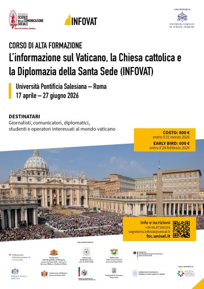 Corso di Alta formazione INFOVAT: termine iscrizioniINFOVAT – conoscere il Vaticano per raccontarlo al mondo è il Corso di Alta Formazione, promosso dalla Facoltà di Scienze della Comunicazione Sociale, che offre strumenti qualificati su Santa Sede, comunicazione e relazioni internazionali, rivolgendosi a giornalisti, comunicatori, diplomatici, studenti e professionisti. UPS |